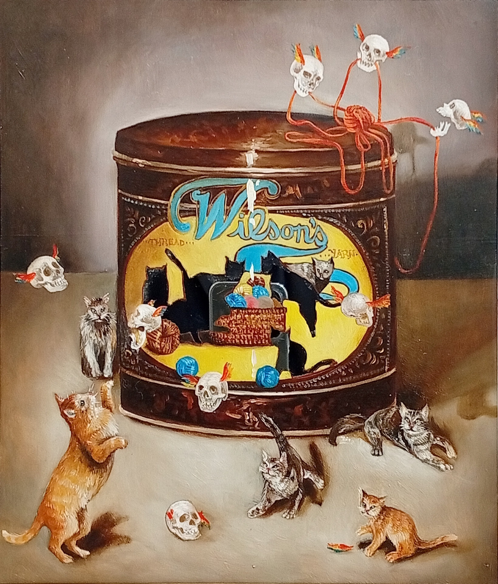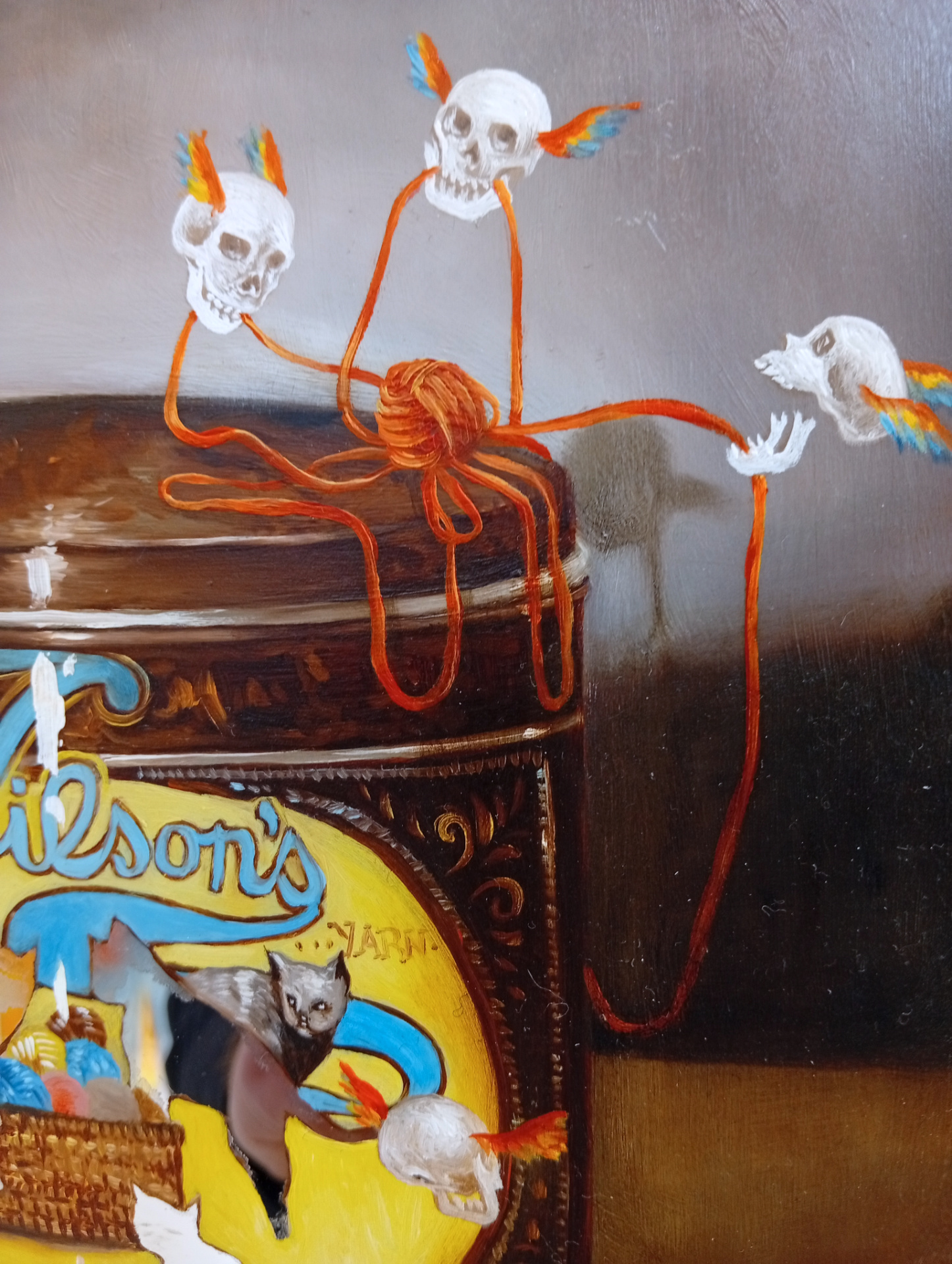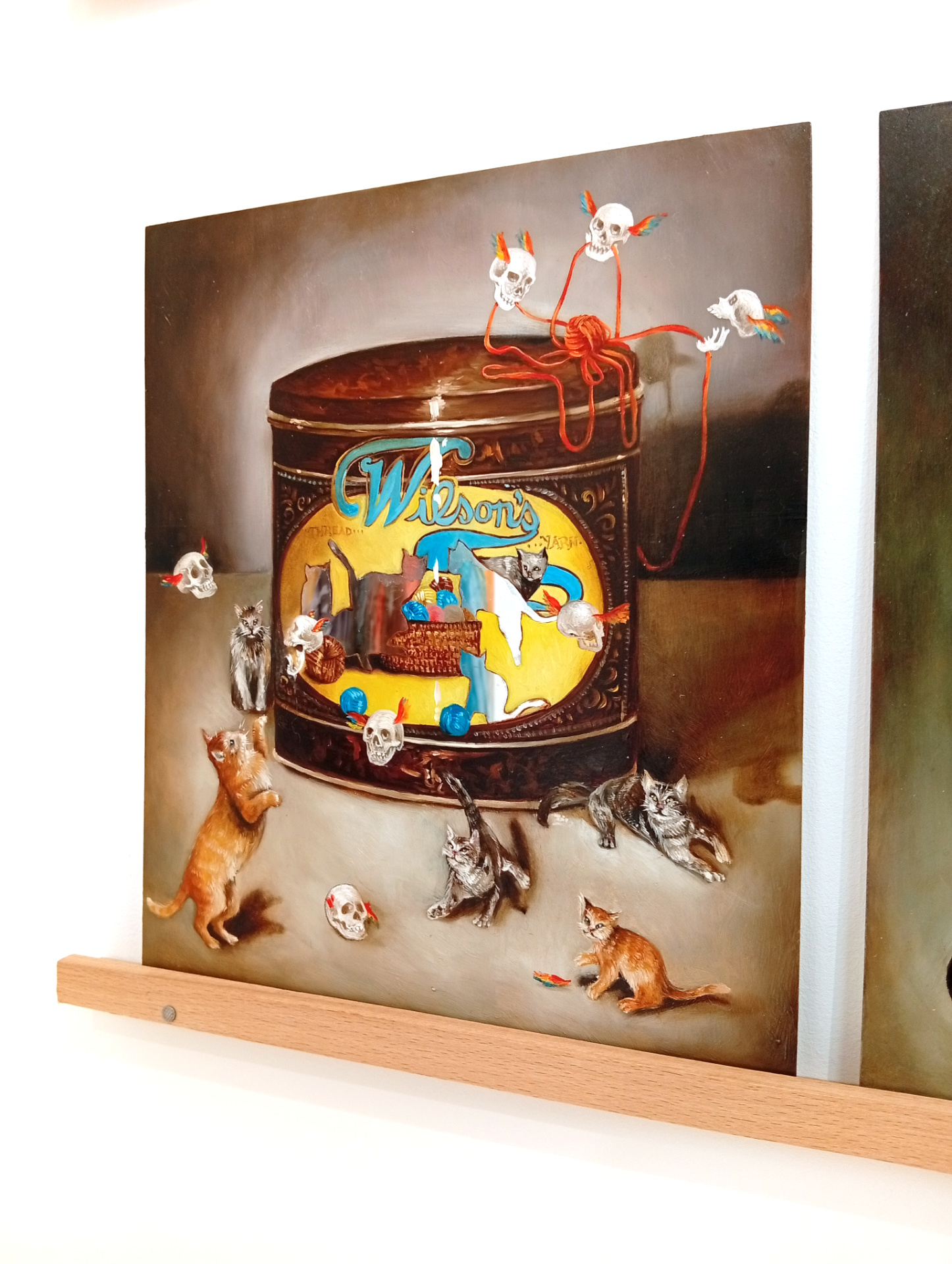 L’humour et le détournement, comme la prise électrique suggerée sur le mur derrière Circéronde, me permettent de déjouer le sérieux de ces représentations, dévoilant la pantomime de mes personnages. Comme Carlo Crivelli qui peignait une courgette au premier plan de ses Saints, l’incongru du détail révèle la pantomime du pouvoir au sein de leur représentaion, dans laquelle ils croient tous pourtant se retrouver sous leur meilleur jour pour la postérité.[…]