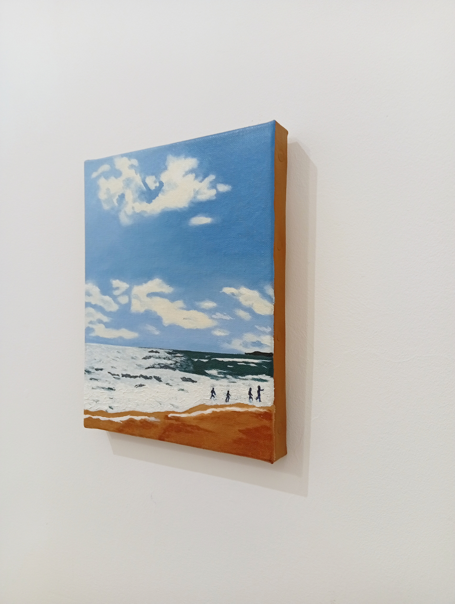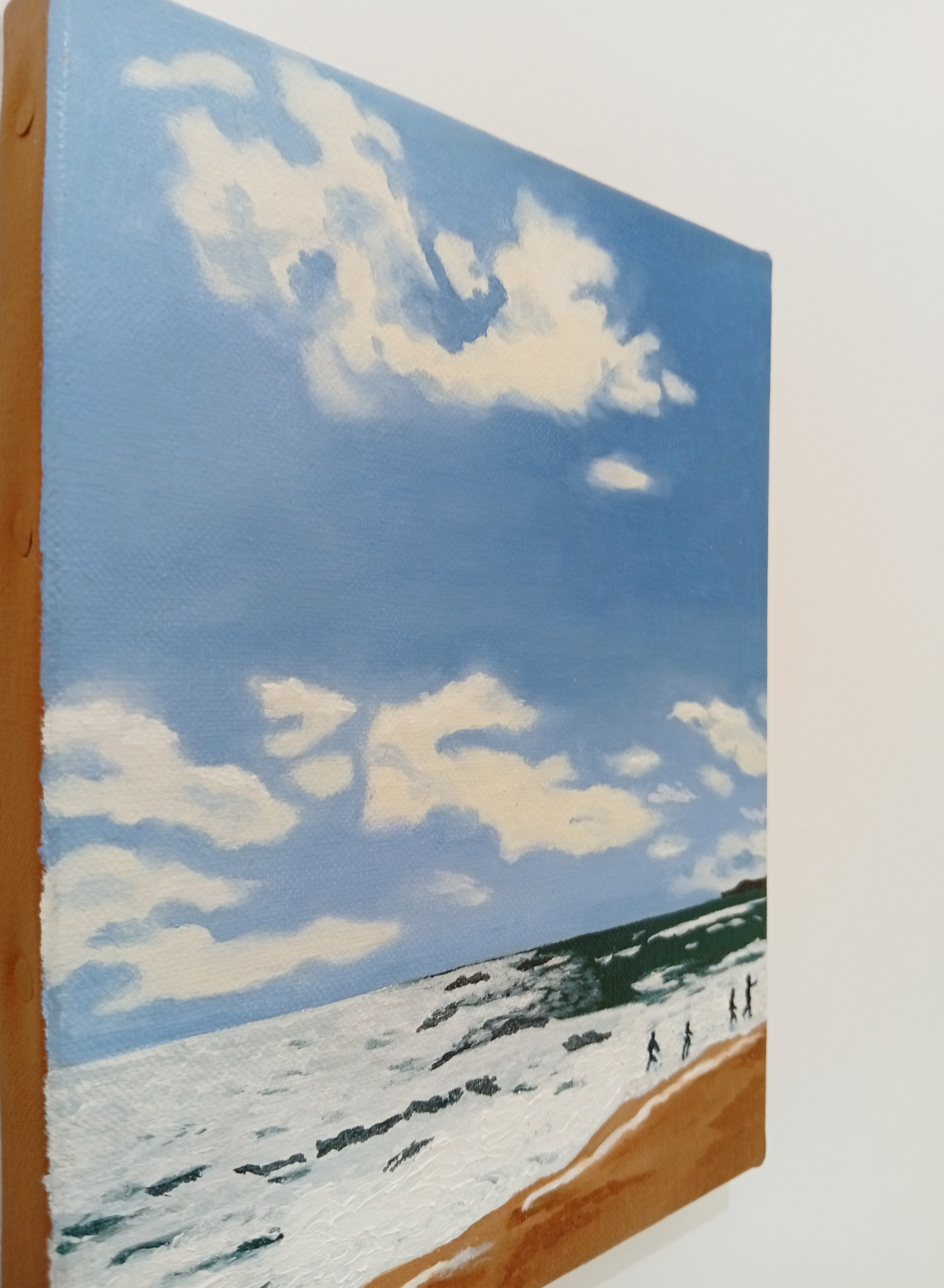 The contrast between the deep blue of the Atlantic Ocean, the vibrant texture of the white foam on the sand, and the light clouds in the sky creates an atmosphere that is both soothing and lively. Small silhouettes playing by the sea evoke freedom and contemplation at the end of this summer day.