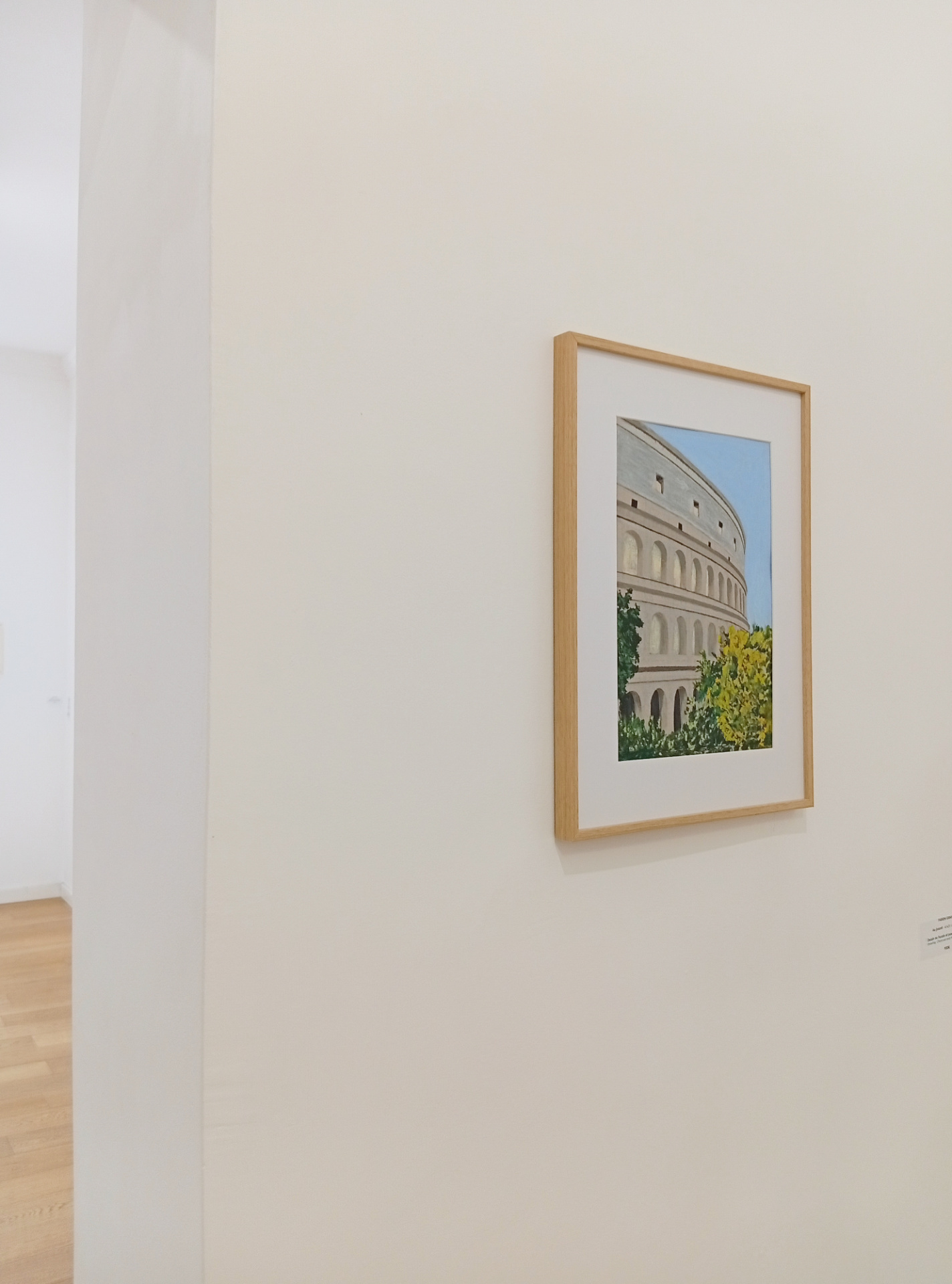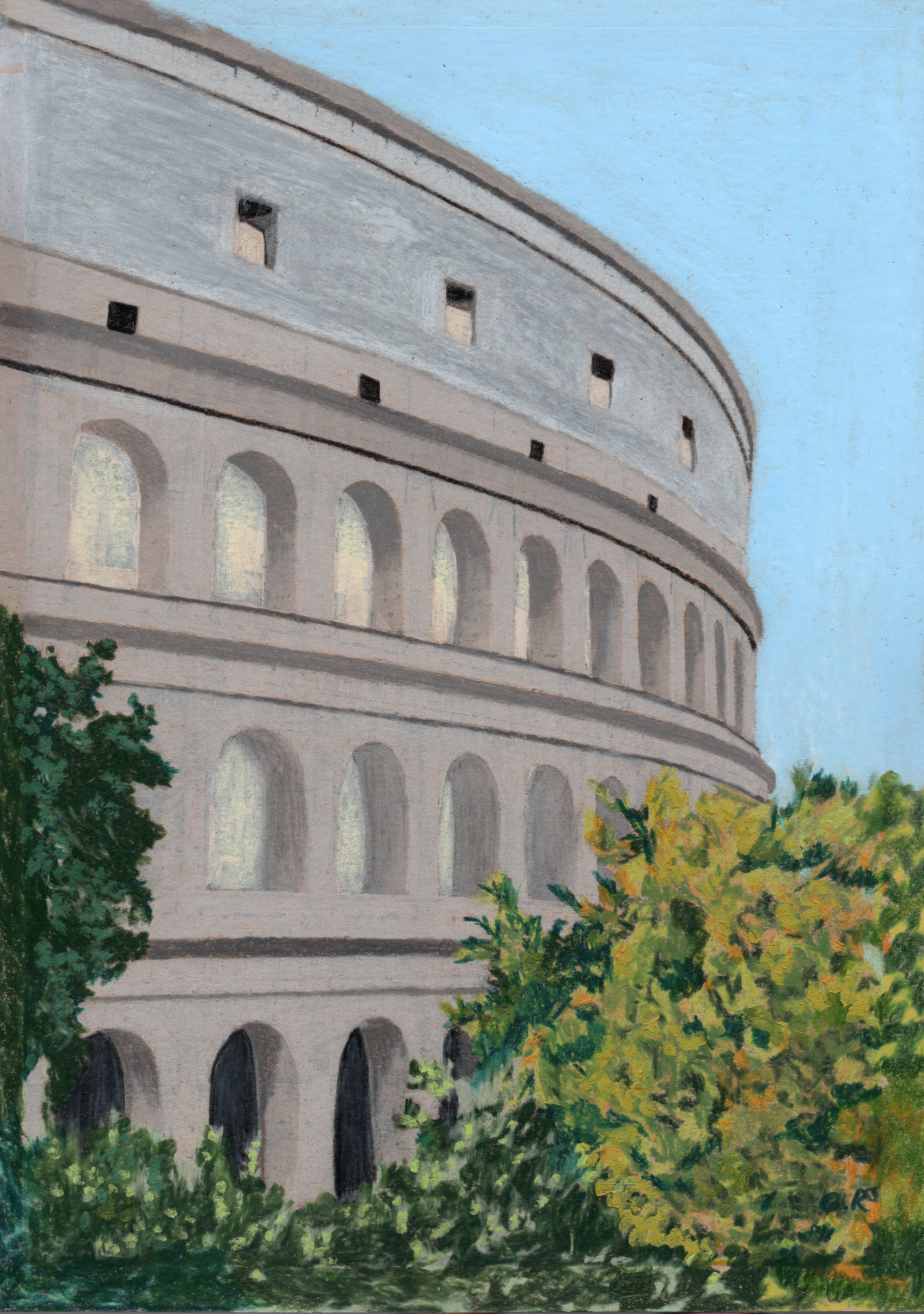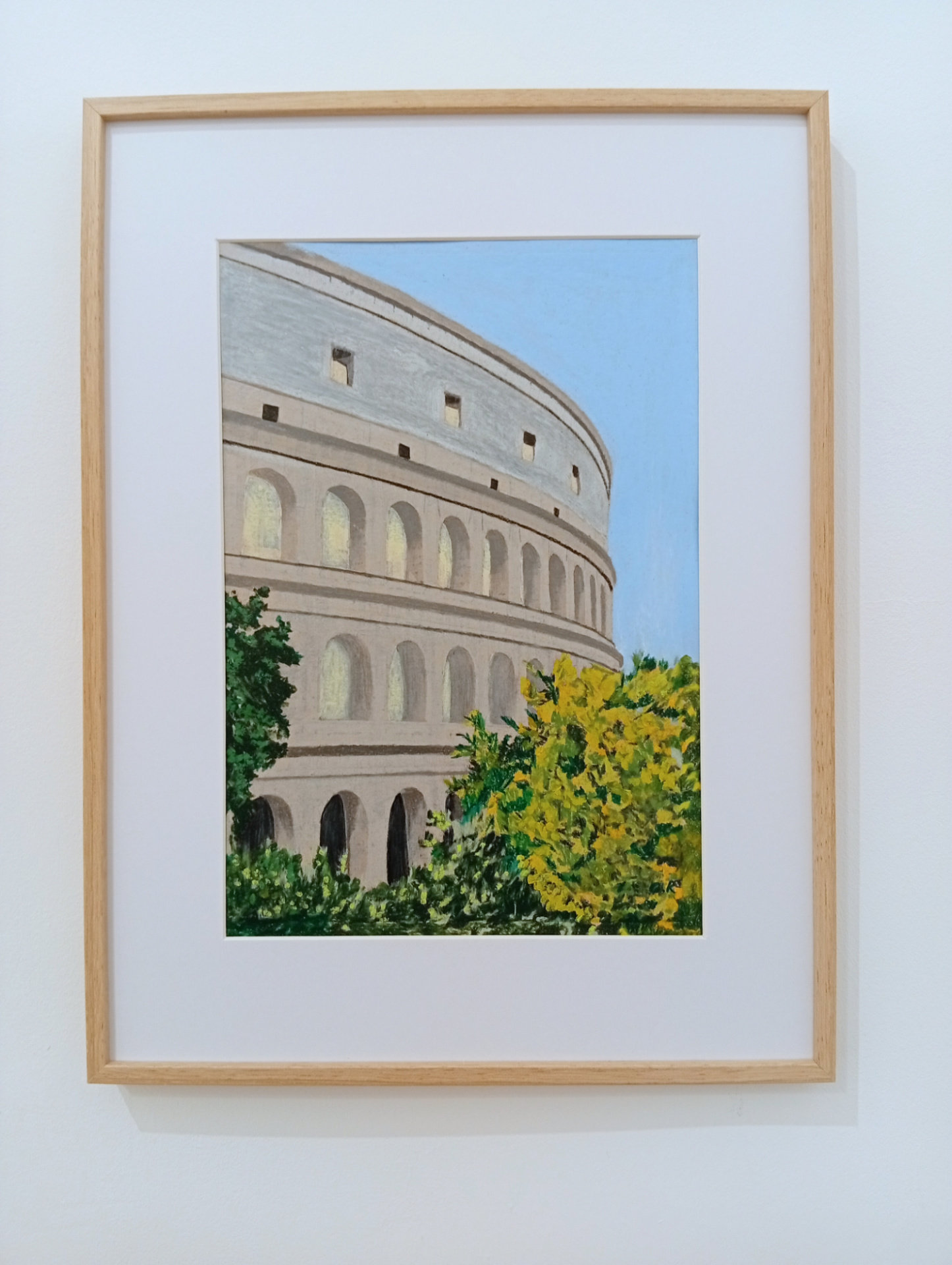 This oil pastel drawing captures the Colosseum in Rome through a striking photorealistic approach, where every architectural detail is rendered. The artist combines the discipline of realism with a contemporary vision. Photorealism, rarely achieved with oil pastels, gives this piece a distinctive intensity. The textures of the stone, the interplay of shadows within the arches, and the softness of the Roman sky blend seamlessly to create a breathtaking sense of reality.